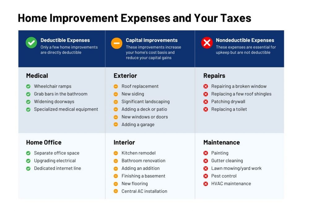 Beyond capital improvement, there are a few specific categories of home improvement that are deductible, including work on home offices (which is subject to specific limitations) and certain modifications for medical/accessibility reasons.^11